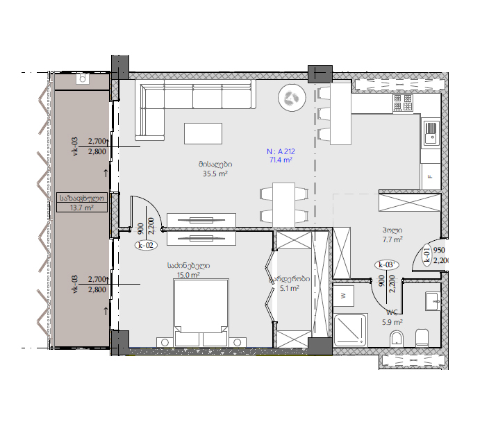 Living Area 71.4 მ²