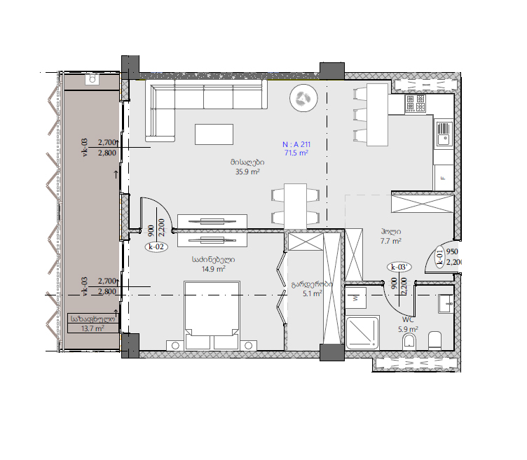 საცხოვრებელი ფართი 71.5 მ²